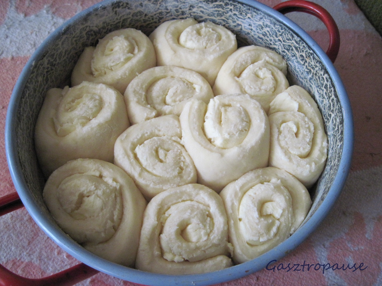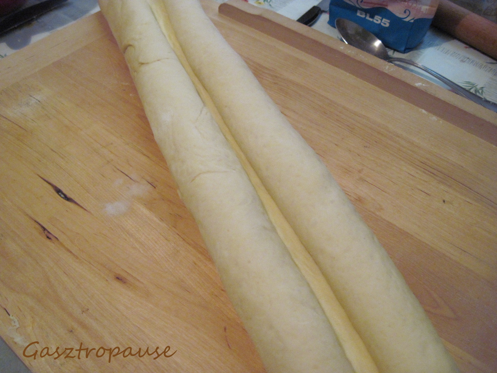 Középen kettévágjuk, így két rudat kapunk. Egy jó alaposan kivajazott és meglisztezett lábosba 5-6 centis darabokat vágunk a tekercsekből és úgy helyezzük el őket az edényben,hogy maradjon köztük elég hely. Hagyjuk még másfél órán át kelni.