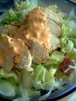 Én amióta világ a világ, ezt a salátát mindig Ezersziget-öntettel ettem, és szerintem ez a tuti hozzá. Viszont házilagos készítményt lusta voltam gyártani, úgyhogy maradt a bolti. Aki nagyon szeretne vigyázni az alakjára, az otthon készítse el a dresszinget, mert a bolti termékek teli vannak cukorral. (na meg ki tudja mivel?)