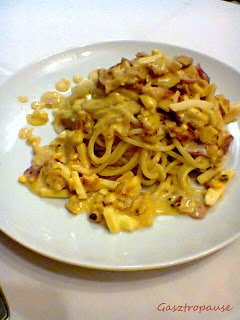 A hússzármazékokat megpirítjuk, előbb a bacont, majd hozzáadjuk a sonkát is, és a zúzott fokhagymát. Miután 1-2 percig pirítottunk (nehogy megkeseredjen a hagyma, ugye), felöntjük egy kevés tejszínnel, és beledobjuk a felkockázott főtt tojást. A két fűszerrel és kevés sóval fűszerezzük, és forraljuk. A tejszínt fokozatosan öntjük hozzá, és ha szükséges, egy kevés vizet is. Nem jó, ha túl híg a szósz. Ennyi is volt a rendkívül nehéz munka. Már csak a kifőtt spagetti tésztához kell keverni.