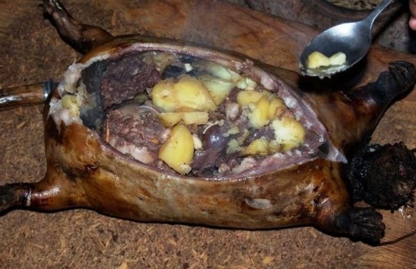 A kecskét vagy mormotát megnyúzzák, a belsőszerveit fűszerekkel és forró kövekkel együtt visszahelyezik a testébe. Ezután dróttal lezárják és a maradék szőrt kívülről lepörkölik.